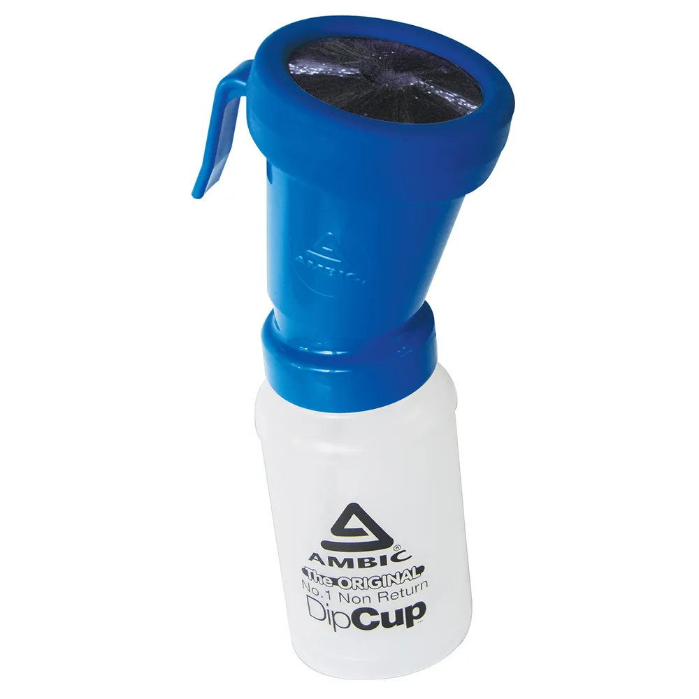 Snap-on, dip saver accessory removes excess dip with every application thus bringing significant savings in chemical use. Easily removed and disassembled for cleanup after milking. For use with Ambic Original, TwinDipper and UniDipper DipCups.