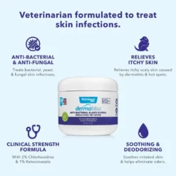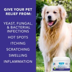 Easy-to-use cleansing and antiseptic wipes created by veterinarians to treat skin infections using a soothing yet effective medicated formula. Can be used to clean paws, and treat ringworm and hot spots. Contain 2% chlorhexidine (a disinfectant that decreases bacteria on the skin), 1% ketoconazole (an antifungal designed to treat skin infections like ringworm and seborrhea), and aloe vera leaf juice. Great for on-the-go, in-home, or anywhere pets need relief from itchy paws and skins. Safe for cats and dogs.