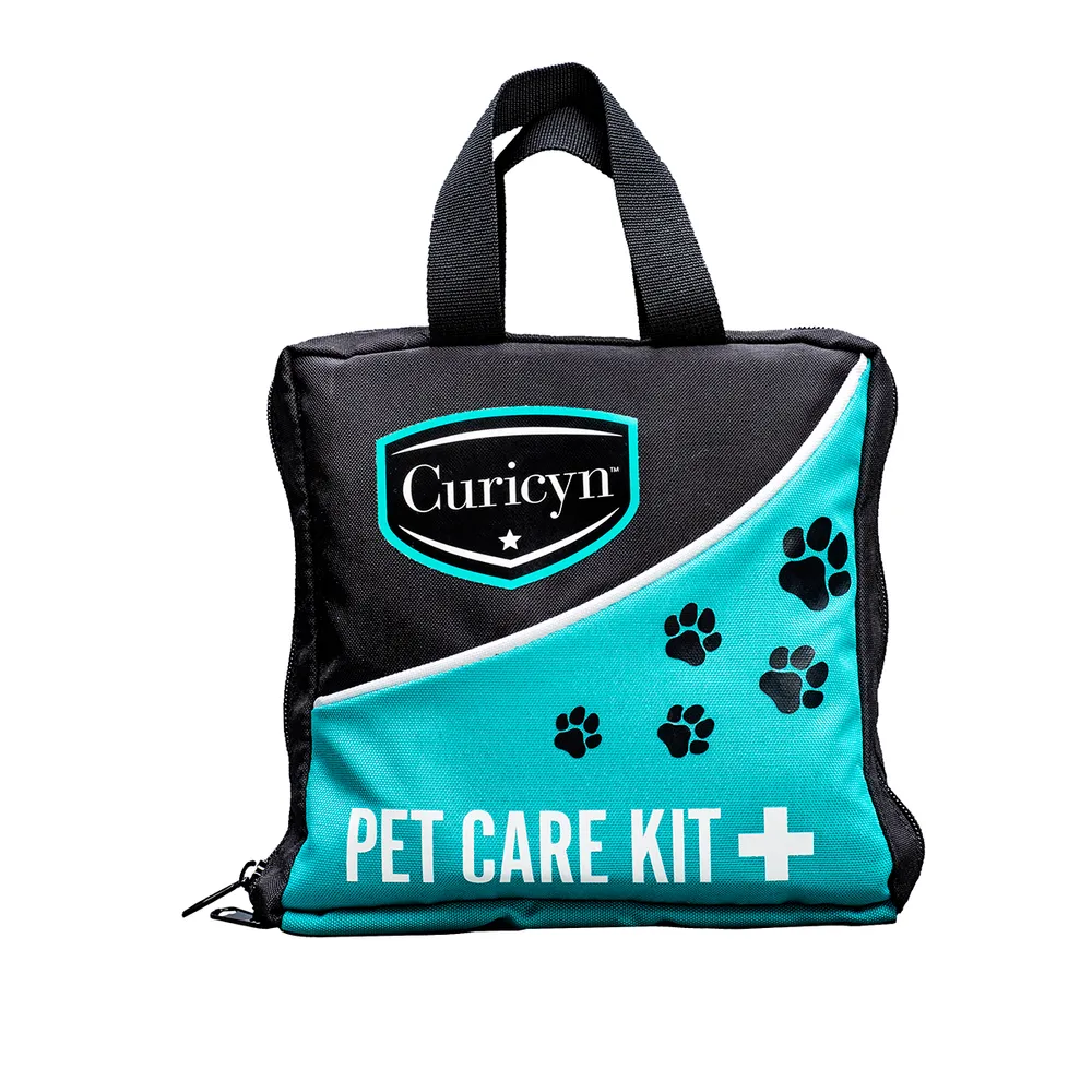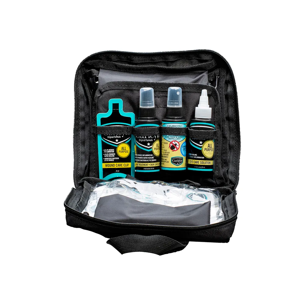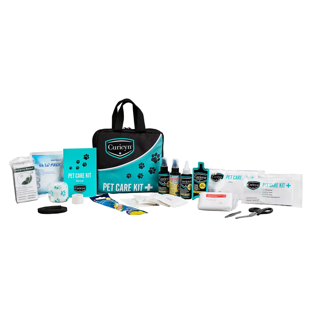 Includes pet first aid manual, 2 oz Curicyn Original Wound & Skin Care Formula, 2 oz Curicyn Eye Care Solution, 2 oz BodyGuard Insect Repellent, 1 oz Curicyn Wound Care Clay, 72″ double-lopped adjustable leash, emergency blanket, instant ice pack, light stick, 2 pairs of vinyl gloves, 1 triangular bandage, 1 flexible cohesive bandage, 4 – 6″x2″ adhesive bandages, 4 – 2″x2″ wound pads, 4 – 3″x3″ gauze pads, 2 gauze rolls, 4 – 6″ cotton swabs, blunt tip scissors, tweezers and roll medical tape.