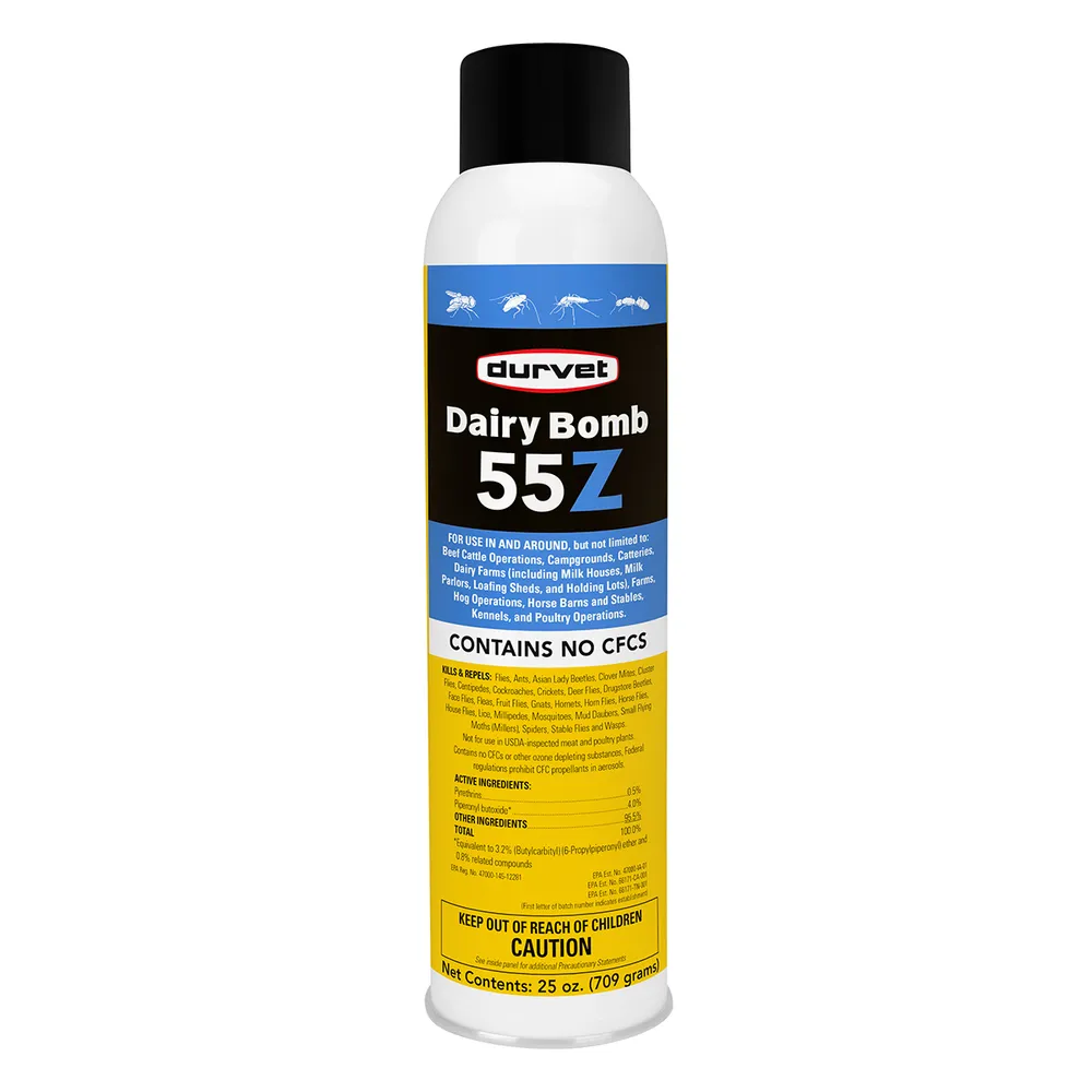 Contains 0.5% pyrethrins and 5% piperonyl butoxide with a solvent-based carrier. Does not hang in the air as long as Dairy Bomb 55.