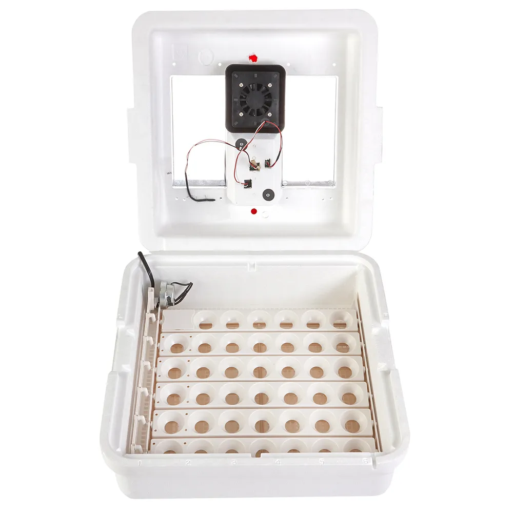 Made of durable styrofoam to retain warmth generated by a gentle heating element controlled by a highly dependable, digital control board. Built-in fan constantly circulates air to maintain a proper temperature throughout the incubator, eliminating harmful hot and cold spots. LCD display with LED light shows accurate temperature and humidity readings instantly. Self-regulating control board adjusts temperature to suit varying environments. Features built-in digital hydrometer and moisture channels to help maintain humidity, a key factor in egg health. Plastic mesh screen safely supports eggs during hatch period and is dishwasher safe. Two viewing windows allow for monitoring the hatching process.