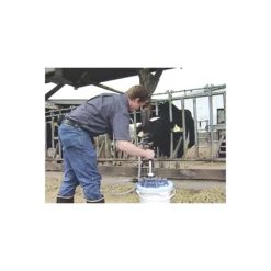 System includes a 6-1/2 gallon bucket with locking screw-top lid, 11.5′ poly-hose and cam-lock fitting for easy detachment. Constructed of hardened plastic and stainless steel hardware to prevent rust and corrosion. Hose features adjustable clamp that locks onto nose tong and frick tube, preventing hose from slipping out of the rumen while pumping. The frick tube and tongs also deter cow from chewing on hose. Red indicator mark on hose helps measure distance from cow’s rumen to insure correct placement of drench. Hand diaphragm pump is top mounted; has the capacity to drench a cow in 1 to 1-1/2 min. Locking lid makes it childproof and easy to carry without spilling. Detachable parts for simple cleaning and storage. May also be used in conjunction with a stainless steel esophageal probe (adapter included).