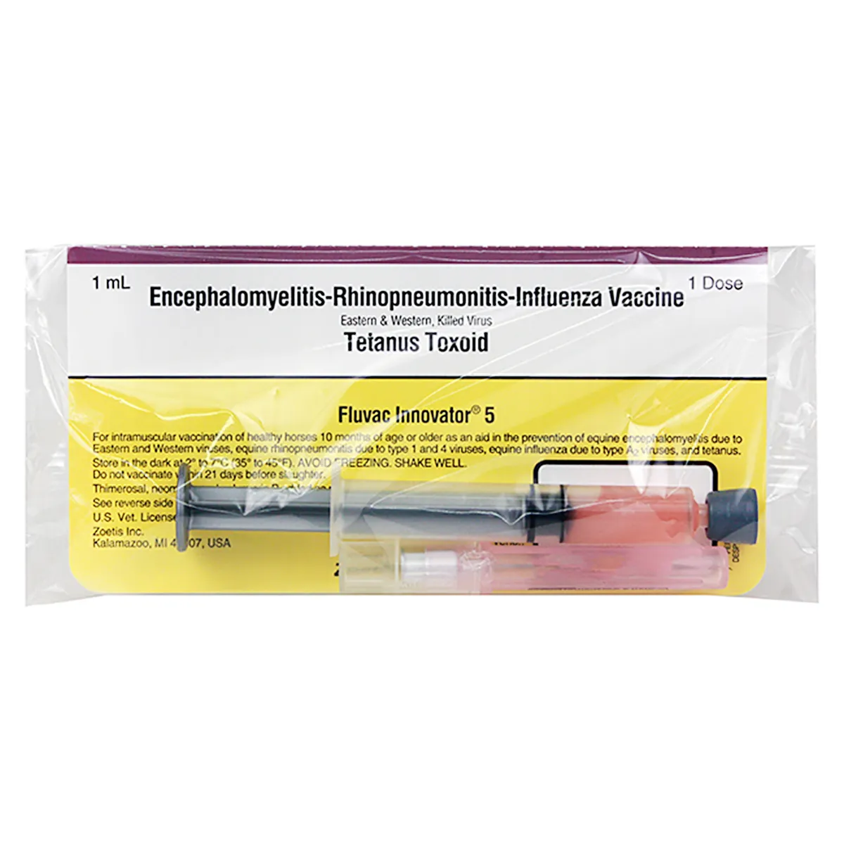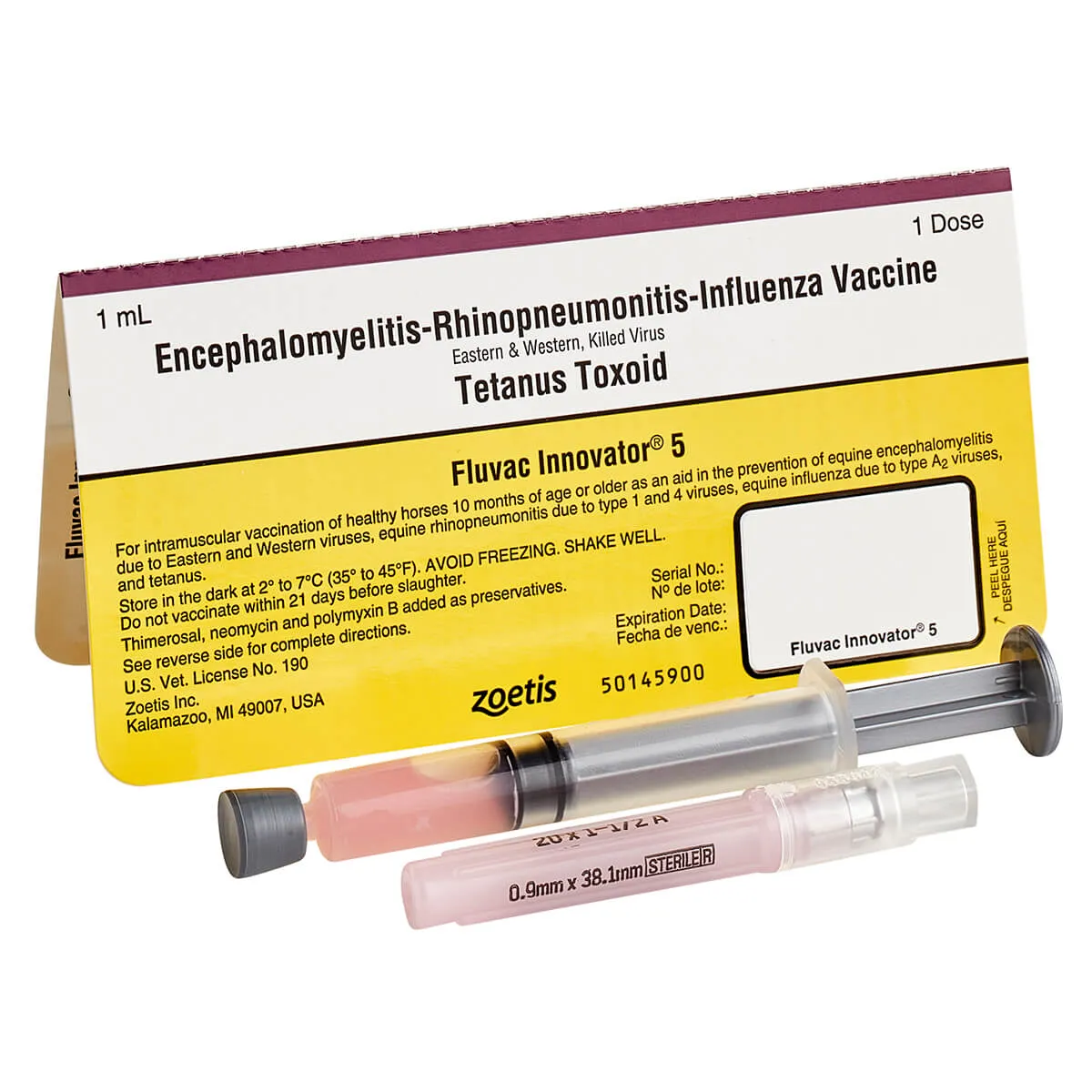 For the vaccination of healthy horses 10 months of age or older as an aid in the prevention of Eastern and Western equine encephalomyelitis, influenza due to type A2 (Kentucky ’97), rhinopneumonitis (EHV-1Â and EHV-4) and tetanus.