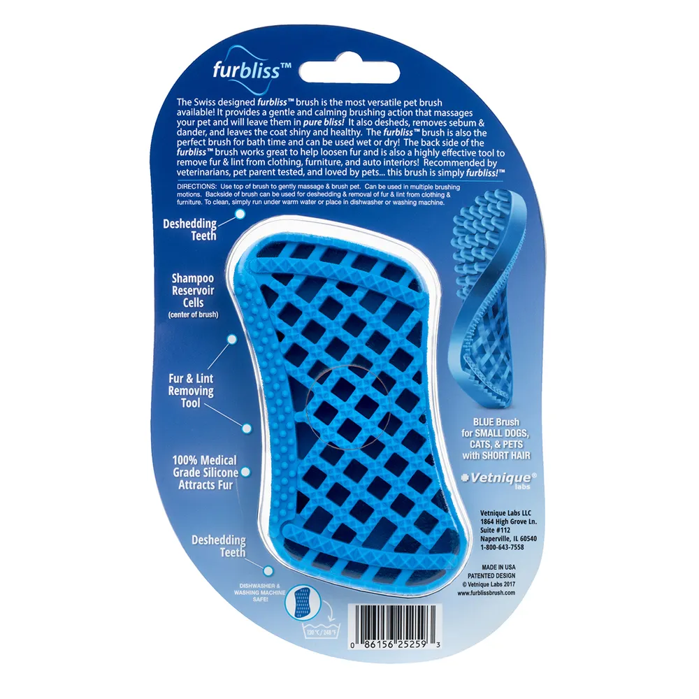 100% medical-grade silicone brush desheds, removes sebum and dander, and leaves coat shiny and healthy. Back side of brush works well to help loosen hair from pet. Also a highly effective tool to remove fur and lint from clothing, furniture and auto interiors. Provides comforting and relaxing massage while stimulating circulation of skin, joints and muscles. Great for use all over the body, including sensitive and smaller areas such as the face, neck, ears and legs. Can be used with shampoos to create a luxurious lather for deeper cleaning during bath time.