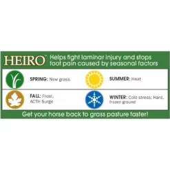 All-natural HEIRO was developed by Dr. Frank Reilly, DVM, to help the rapidly growing number of horses suffering from chronic sore feet with high insulin levels. From spring’s new grass and summer’s heat to the frosty grass and frozen ground of winter, seasonal factors can cause serious laminar injury and chronic foot pain. Fortunately, after two years and hundreds of insulin tests, Dr. Reilly discovered the right combination and concentration of organicals to help improve insulin control and get your horse back on the pasture where they were born to graze and play. No more dirt lot. Get your horse back to grass pasture faster with HEIRO. Try risk-free today!