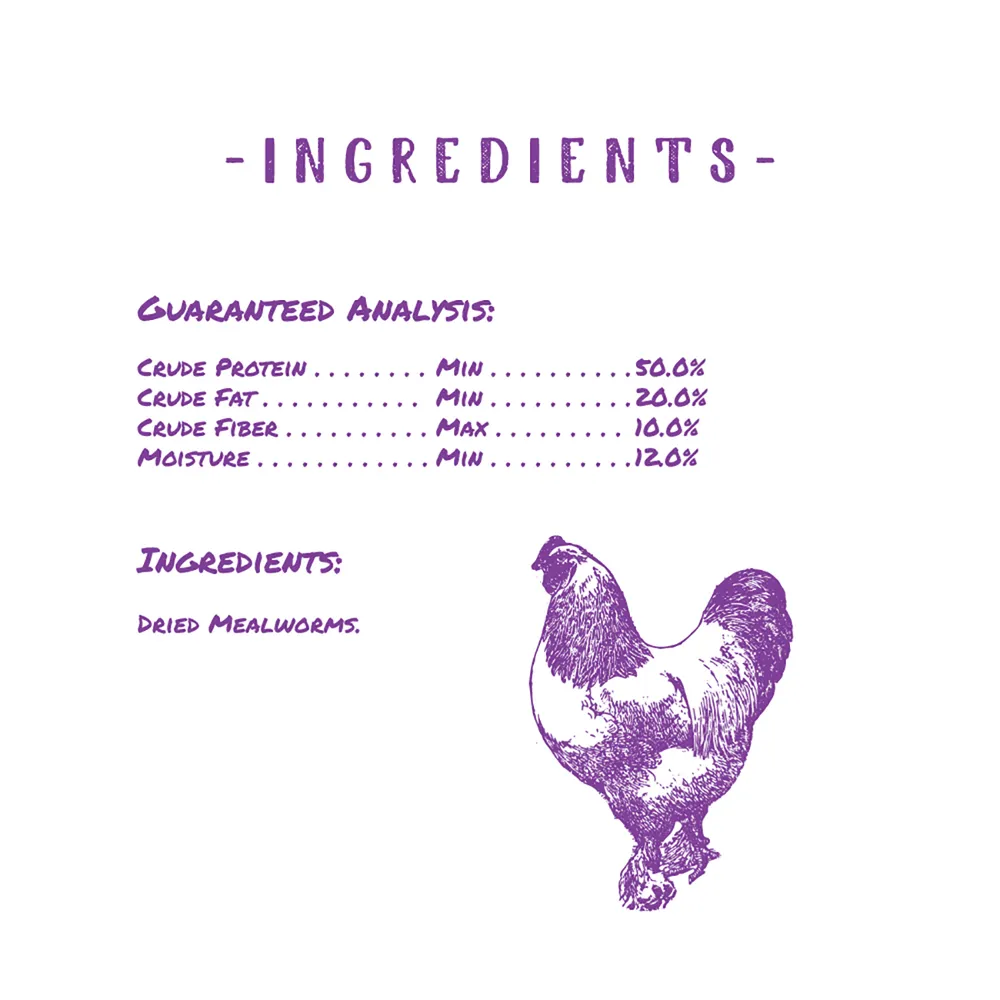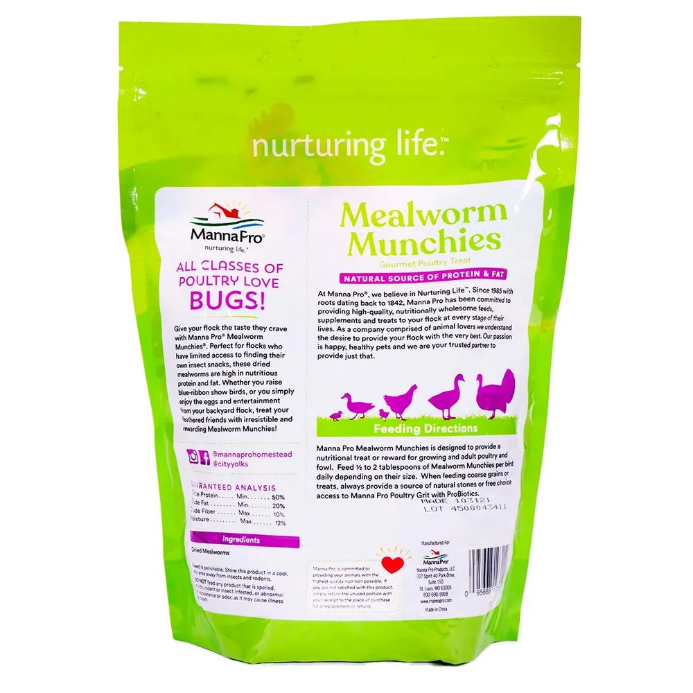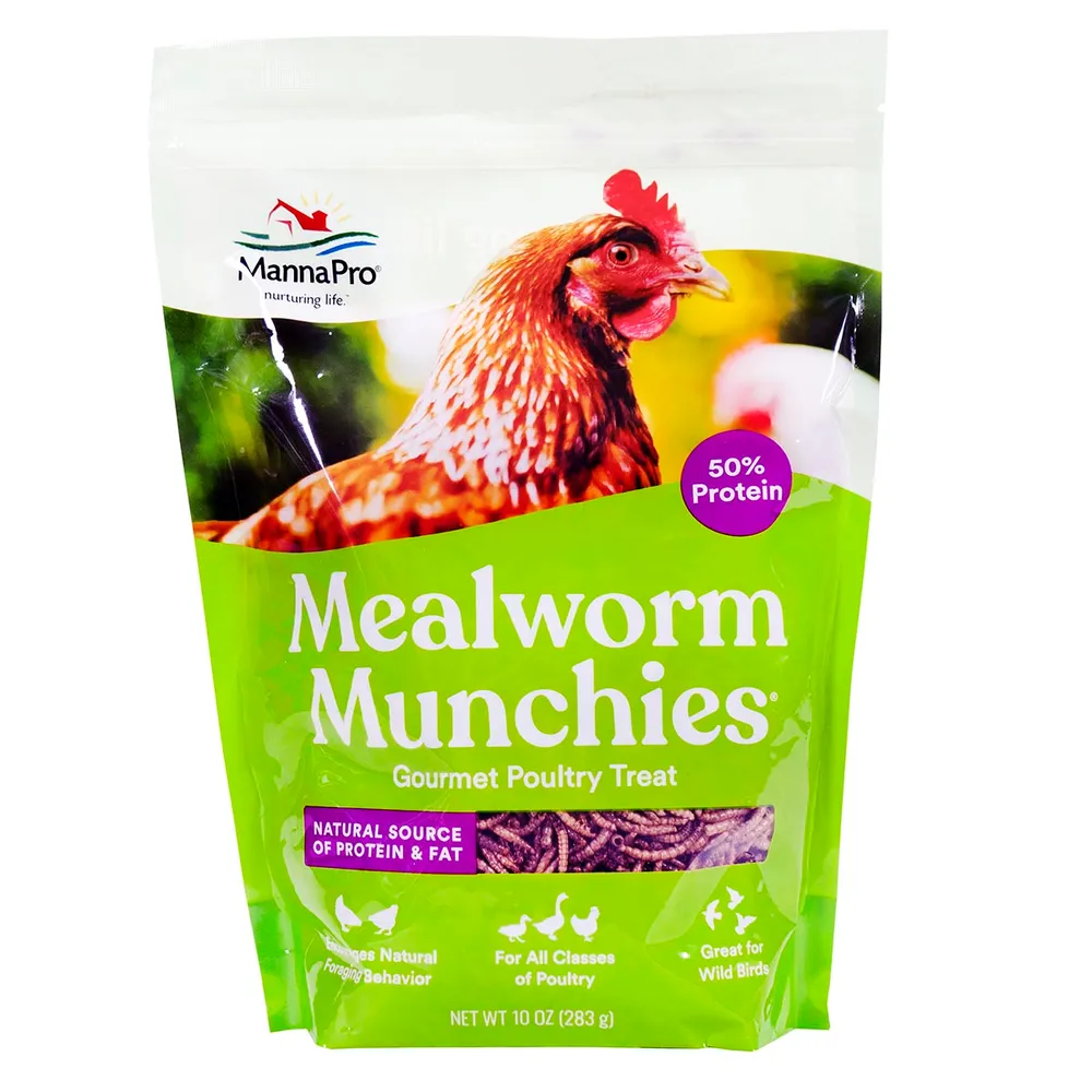 All classes of poultry love to eat bugs! Mealworm Munchies give flocks the taste they crave! Perfect for flocks who have limited access to finding their own insect snacks, these dried mealworms are high in nutritious protein and fat. Manna Pro understands that animals are companions as well as providers. So whether it’s raising blue-ribbon show birds, or simply to enjoy the eggs and entertainment from a backyard flock, treat feathered friends with wholesome and delicious Mealworm Munchies! 100% dried mealworms provide a nutritional treat or reward for growing and adult poultry and fowl.