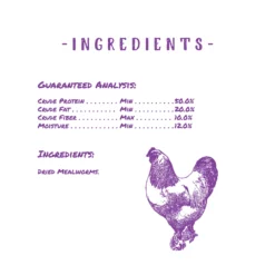 Contain min 50% crude protein, min 20% crude fat, max 10% crude fiber and max 12% moisture. Directions: Feed 1/2-2 tablespoons per bird daily depending on their size.