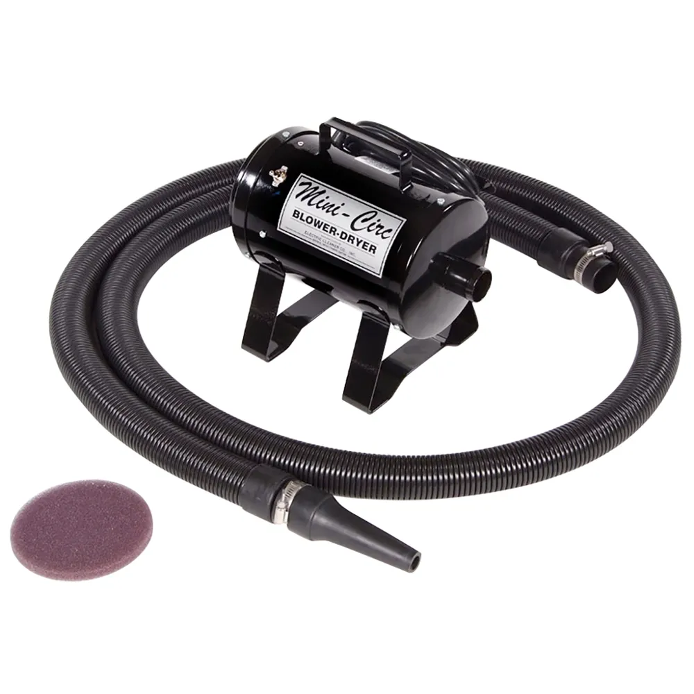 Powered by a Lamb motor to help cut your grooming time. The lightweight, heavy-duty Mini-Circ features an 18-gauge steel body, 10 ft hose blower tip and filter. Provides 9.5 amps. May be suspended or set on the ground, whichever works best for you.Â