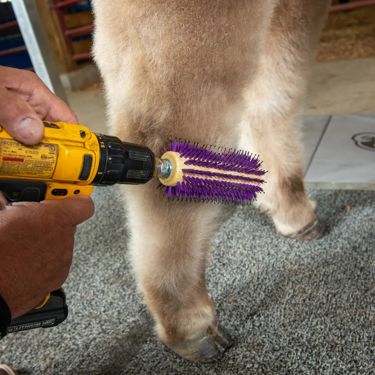 Trains hair and wool and helps stimulate growth when used daily. Brush pull-up separates and defines leg hair and wool as the first step in the fitting process. Long ball-tipped bristles stimulate the undercoat while short fiber bristles help fluff longer top hairs for greater pop and bloom. For use with a drill for rotation. Â