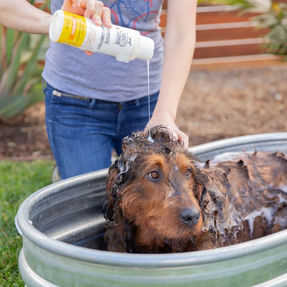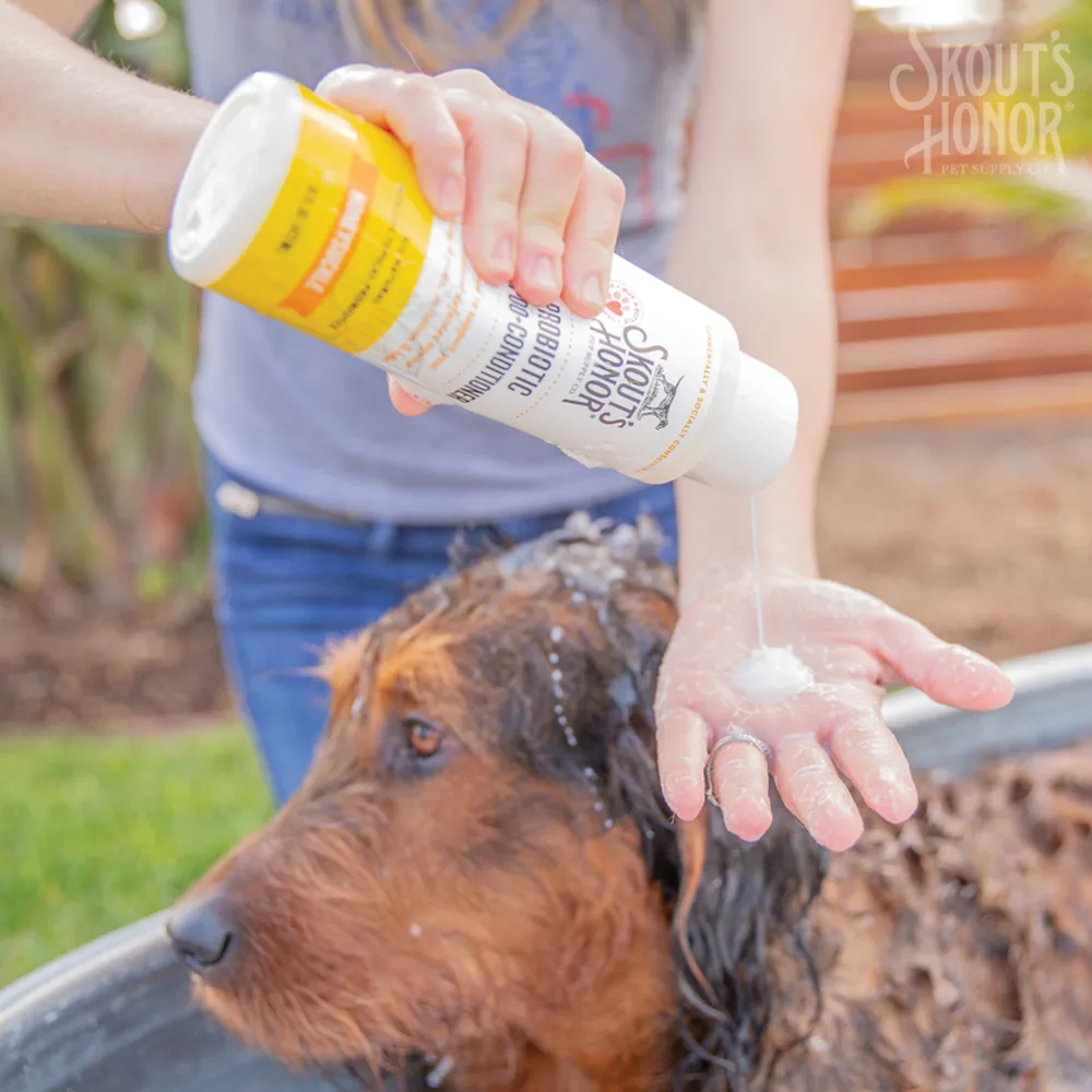 Directions: Shake well. Wet coat thoroughly with warm water. Apply from the back of the ears to the tail. Lather and gently massage into coat and skin, being careful to avoid the eyes. Rinse well. Repeat as necessary. For best results, use with Skout’s Honor Probiotic Daily-Use Deodorizer and Skout’s Honor Probiotic Daily-Use Detangler. Skout’s Honor products do not contain sulfates, parabens, triclosan, added colors/dyes, petrolatum, cocabetaine, fillers or dea. Products are never tested on animals and are eco-friendly, plant and mineral-derived, and bio renewable.