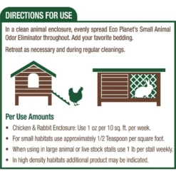 Directions: In a clean animal enclosure, evenly spread throughout. Add your favorite bedding. Retreat as necessary and during regular cleaning. For chickens and rabbits– use 1 oz per sq ft per week. Small habitats– use approximately ½ tsp per sq ft. Large animal and live stock stalls – use 1 lb per stall weekly. In high density habitats additional product may be indicated.