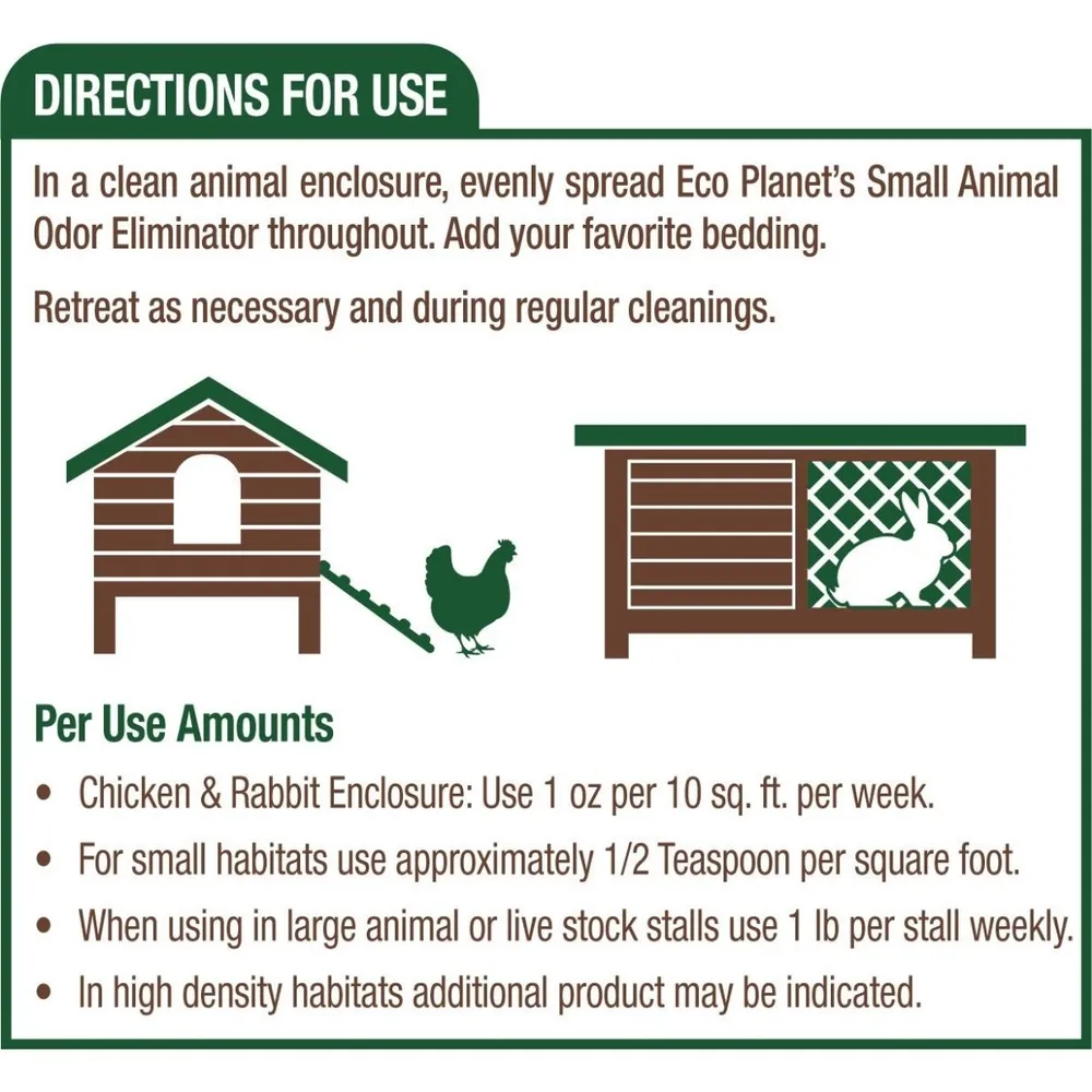 Small Animal Odor Eliminator stops the production of odors with zeolite- a mineral treated with an all-natural breakthrough formula, reducing fecal odors and stopping the formation of ammonia. One treatment eliminates odor for up to 1 week. Eco-friendly and safe for use with all bedding materials. Effective with multiple species. Â