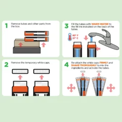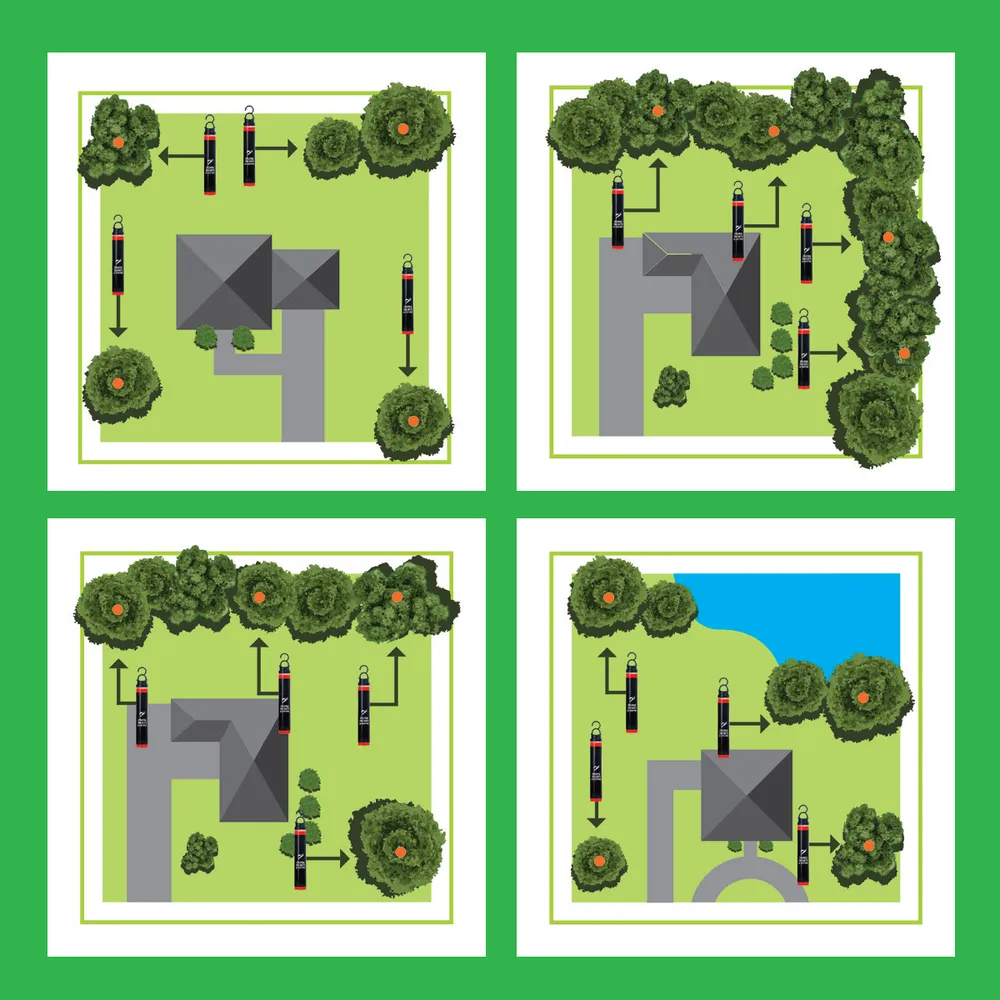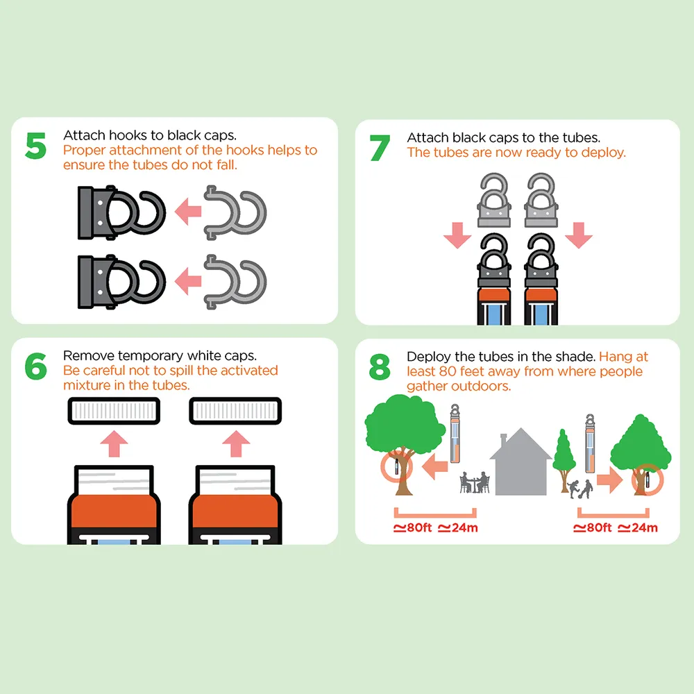 Directions: Remove white cap, add warm water to fill line indicated on back of tube. Re-attach white cap and shake to mix ingredients and activate tube. Remove white cap, attach hook to black cap, then attach to tube. Hang the tubes in the shade approximately 6 ft off the ground at least 80 ft away from where people gather, but not farther than 180 ft apart. If property has woods, heavy vegetation, or a water feature, hang at least one tube in or near that area. Replace every 30 days.
