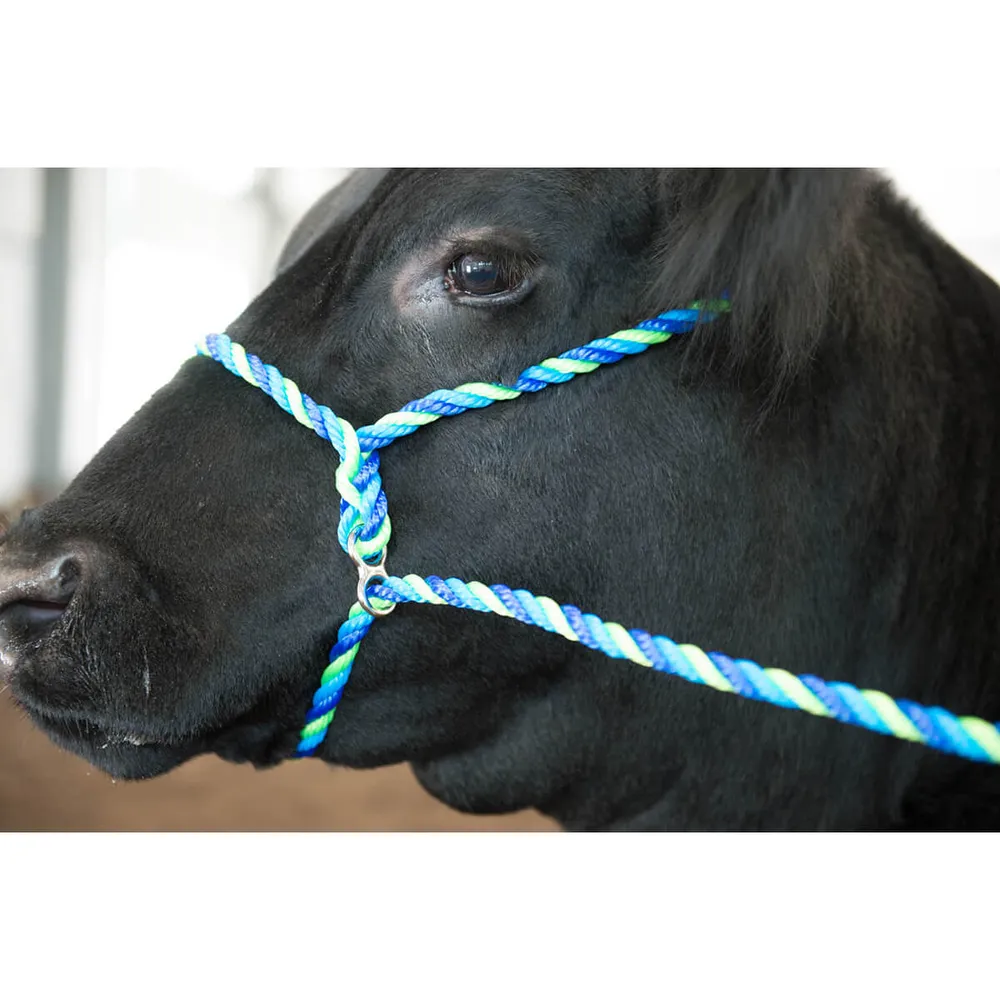 Nickle plated hardware, designed by Kirk Stierwalt, allows for quicker pull-and-release action to help prevent swollen jaw often caused by the slower release of conventional breaking halters. This unique hardware also helps prevent the poly rope from rubbing together for easy sliding action. The pressure points and easy-slide action of this halter stimulate the performance of a show halter and chain so the calf gets used to the feel of a show halter sooner.