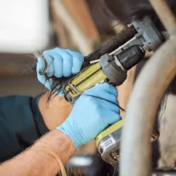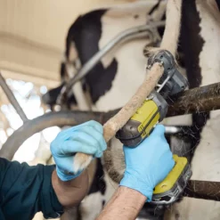 Outer blade oscillates over a stationary inner blade; no risk of injury to animals or humans. Secured by way of the chuck shank into any suitable cordless drill of 14 volts or better, and operating at approximately 1,200-1,750 rpm. Trimming takes 3-4 seconds per tail; can easily be accomplished during milking. Even dirty dag-ends feed smoothly through trimmer. No need to pre-cut tail’s switch. Features a neck strap so device is hands-free between cows.