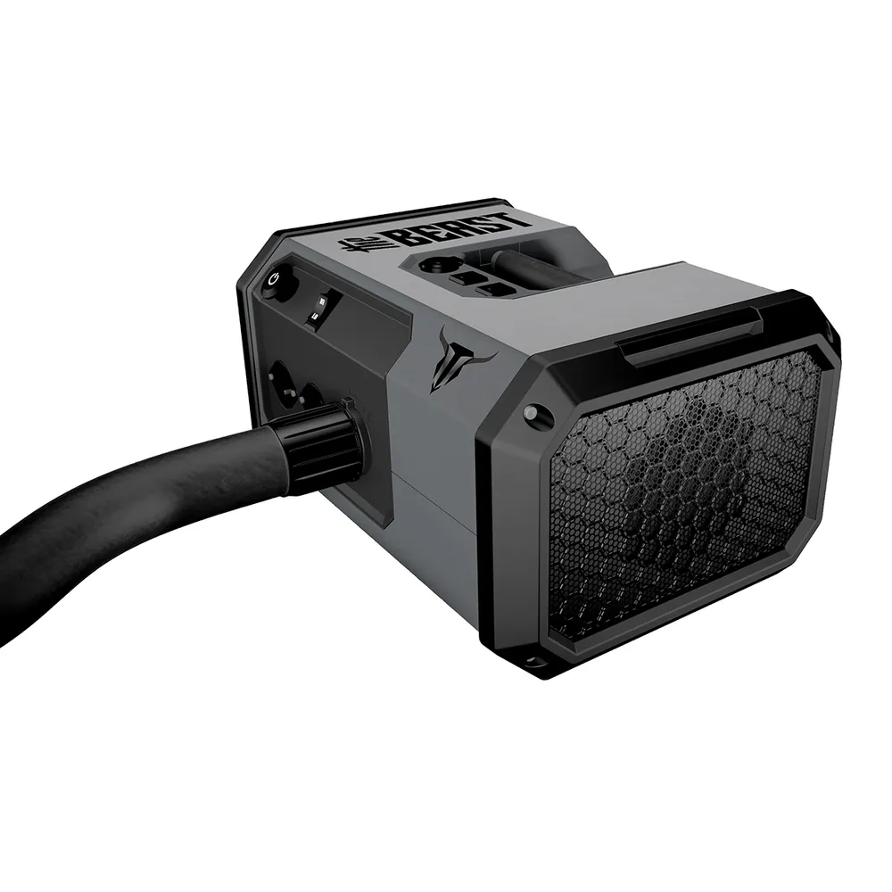 Powder coated steel top cover and rubber infused bumpers for added durability. Features 2 low amperage motors (15 amps each), 2 USB ports, quick connect hose attachment, one step push button power switch and dual stage air flow switch. Engineered air technology allows for extended motor life, more power and less amperage. Built in cleats allow The Beast to be attached to a wide variety of accessories. One comfort grip handle and 2 secondary handles enable user to carry blower in multiple ways. 120V outlets for clippers, drills, etc. Internal compartments help protect interior components from dirt, moisture and heat. Â