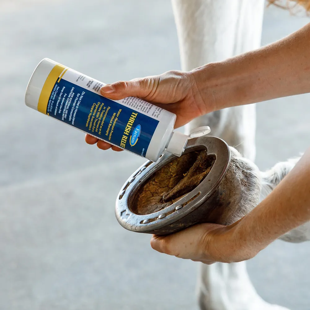 Helps clear out equine thrush quickly. Permits air to penetrate for quick recovery and preventative action. Thrush Relief horse thrush treatment is water-resistant; no bandaging needed.
