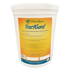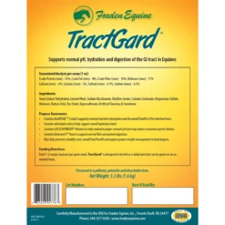 Pelleted mix of mineral salts, electrolytes, yeast and linseed meal designed to pull water into and lubricate the GI tract, buffer excess acids, and support normal digestion and healthy bowel function. Great for horses under stress, before shipping or showing, strange show grounds and other places horses may not drink, and chilly nights. May help reduce cribbing linked to high stomach acidity. May reduce stomach discomfort when given in conjunction with administering NSAIDs.Tractgard uses linseed meal as a manure softener, GI tract lubricant and protein source. Protein from linseed meal helps maintain healthy weight and supports healthy hoof and hair growth. Diamond V yeast supports fiber and protein digestion. Combined with the protein from linseed meal, it helps maintain healthy weight and supports healthy hoof and hair growth. Calcium carbonate helps maintain proper stomach pH. Feeding with meals may reduce discomfort associated with stomach acidity from excess grain intake. Electrolyte salts help encourage increased water intake through drinking.