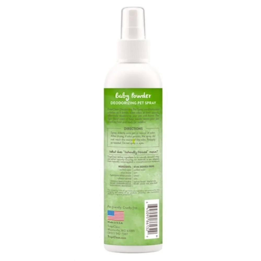 Help pets smell baby-powder-fresh with this soft and light fragrance. Add extra freshness after bathing or between baths with TropiClean’s Baby Powder Pet Spray. Eliminated odors at their source! Spray directly on pet’s coat to help condition fur while reducing static. The long-lasting fresh scent lasts for days, so pet’s look and smell like they’ve just been bathed! Cruelty-, paraben-, and dye-free. Made from naturally derived ingredients. Safe for use on dogs, cats, ferrets, hamsters, rabbits, and other small animals.