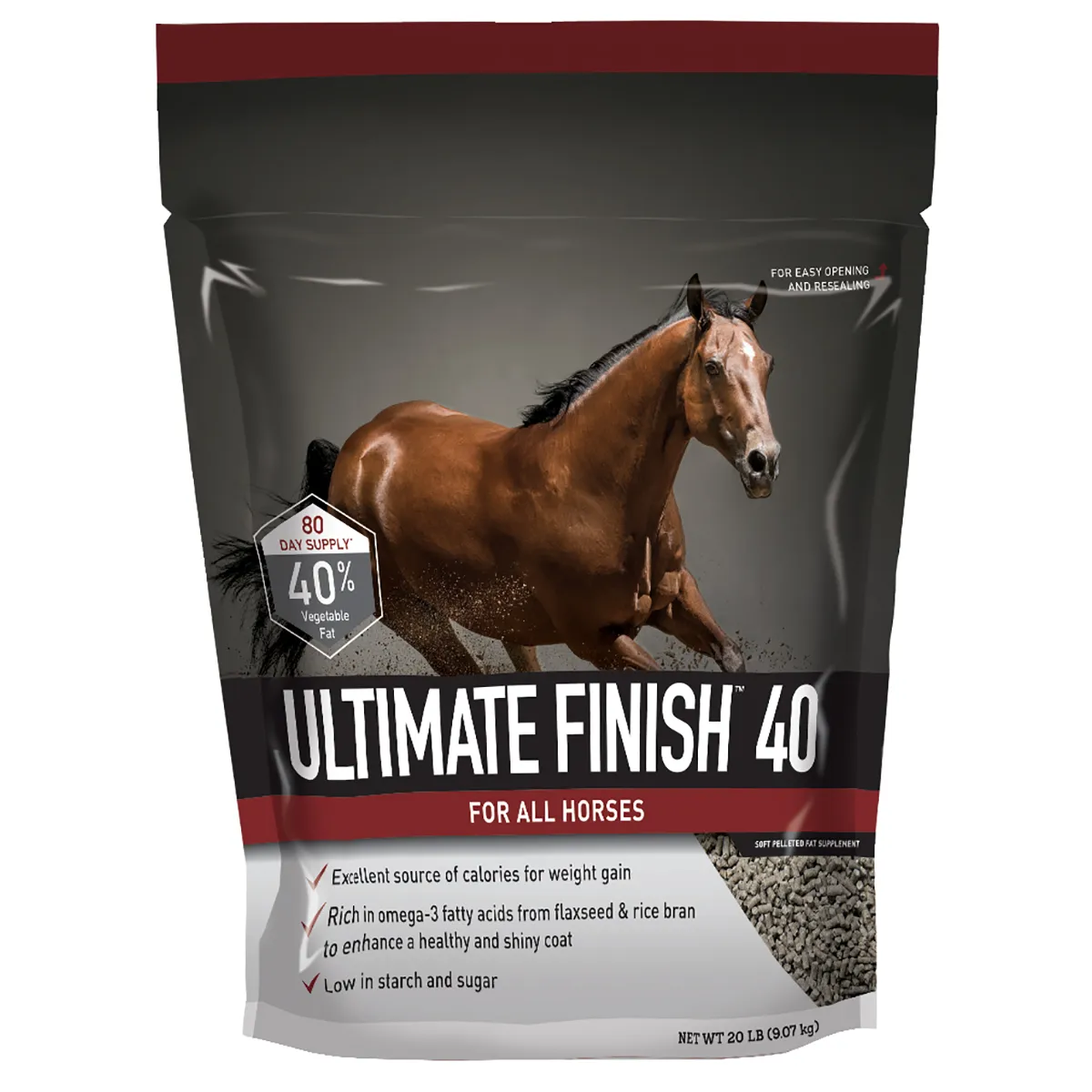 Directions: Top-dress on ration slowly, start with 2 oz daily and work up to recommended feeding rate based on desired result. To help promote skin and coat condition – 2-4 oz daily per 1,100 lb horse. For increased calories to support weight and body condition – 4-8 oz daily per 1,100 lb horse. 80 day supply = 20 lbs at 4 oz feeding rate.