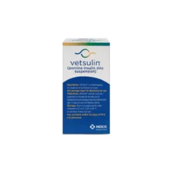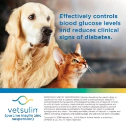 Vetsulin® (porcine insulin zinc suspension) is an injectable insulin suspension that reduces high blood sugar (hyperglycemia) in dogs and cats with diabetes mellitus. Controls glucose levels and lessens signs of diabetes. Starts working quickly, and is long-lasting. Shake to mix.