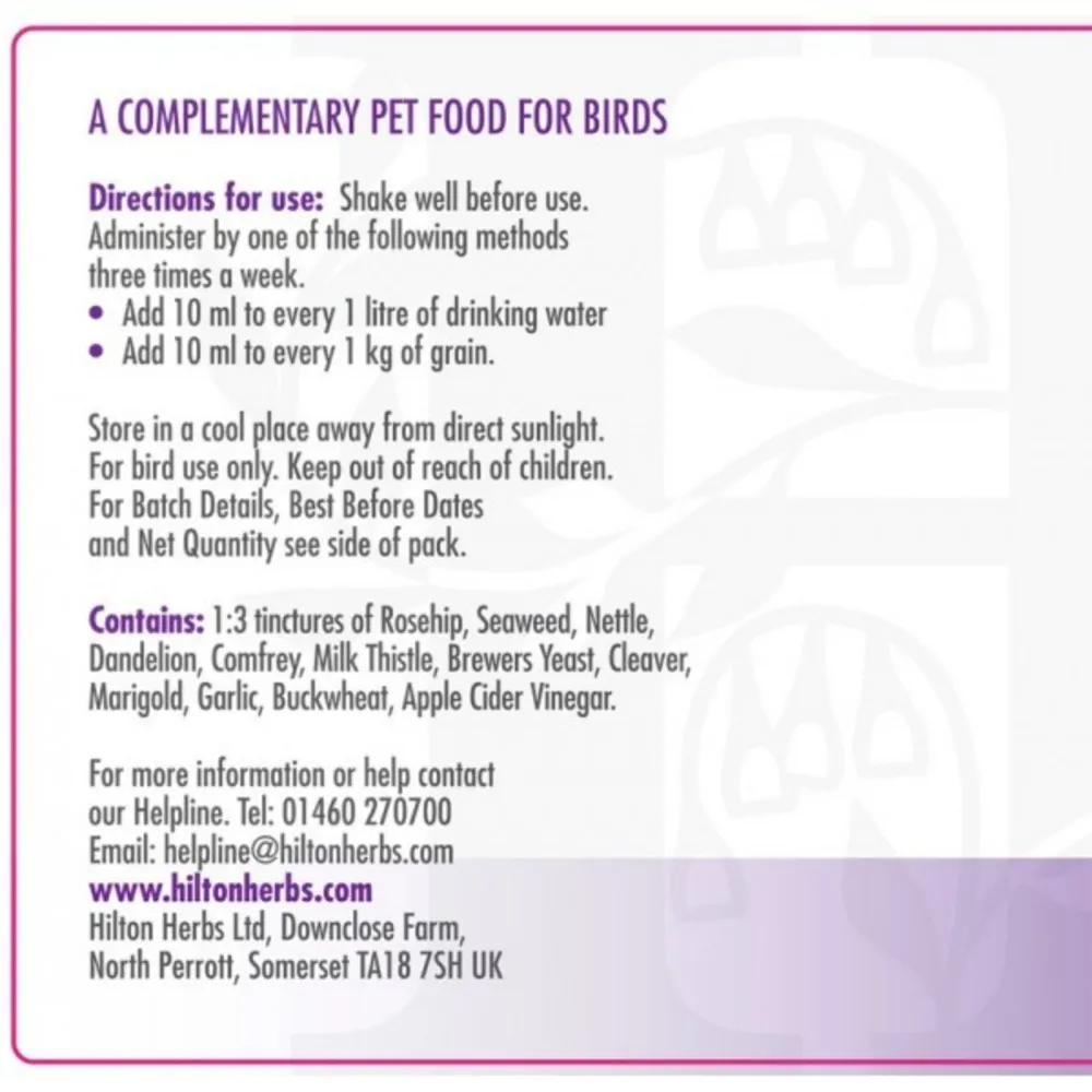 Provides birds with a natural and balanced source of vitamins, antioxidants, minerals, trace elements and amino acids. Formulated using only plants, herbs, seeds, roots, flowers and natural ingredients to provide birds with a balanced blend of essential nutrients.